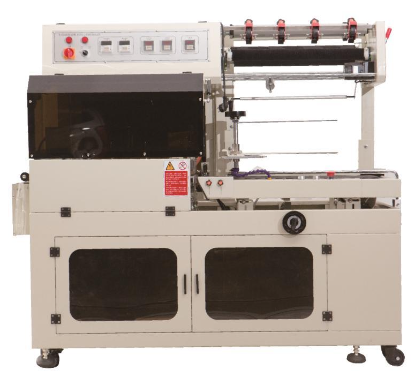 보통은 수축터널과 함께 수축포장을 위한 전처리 기계로 사용됩니다.